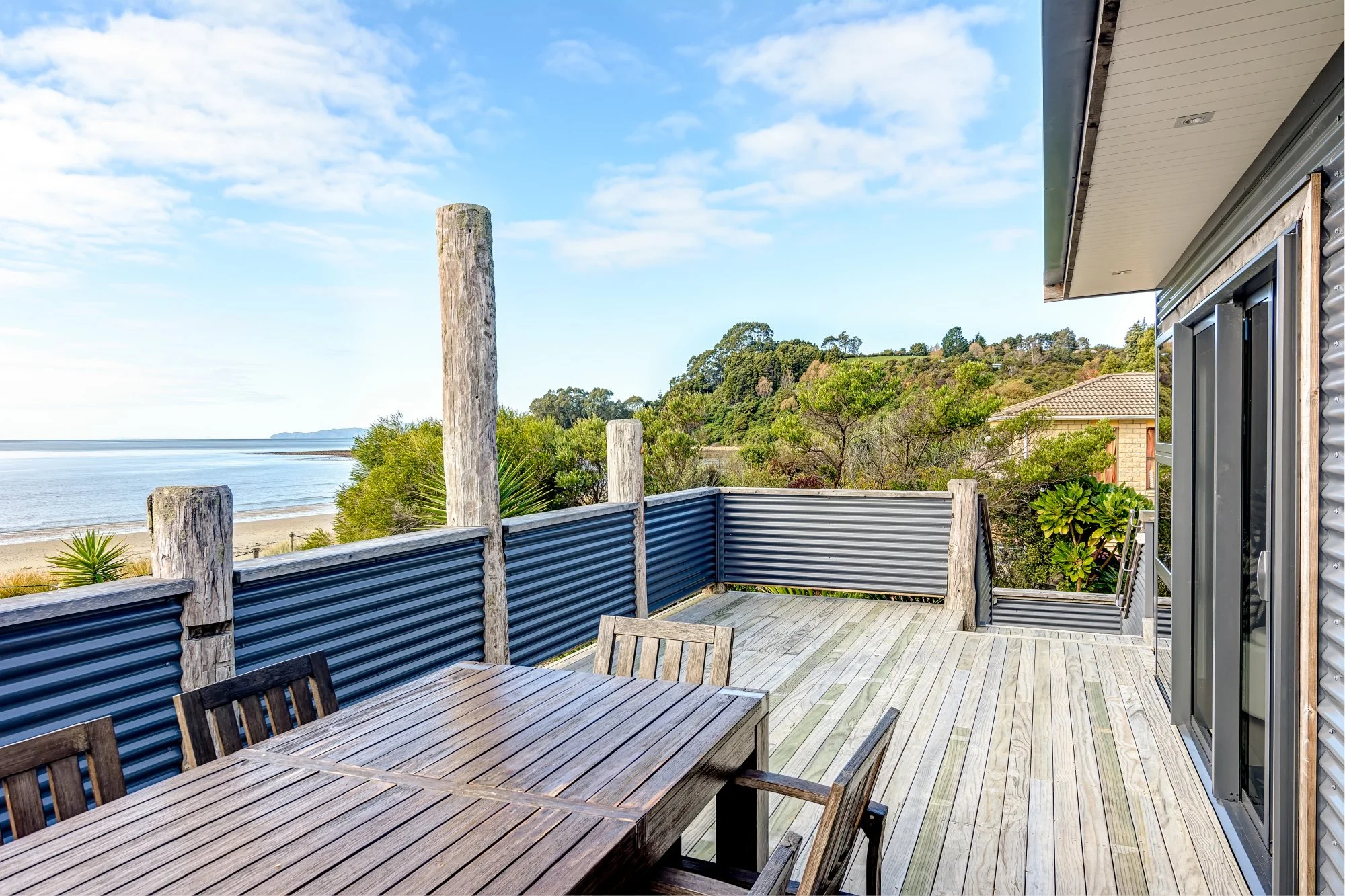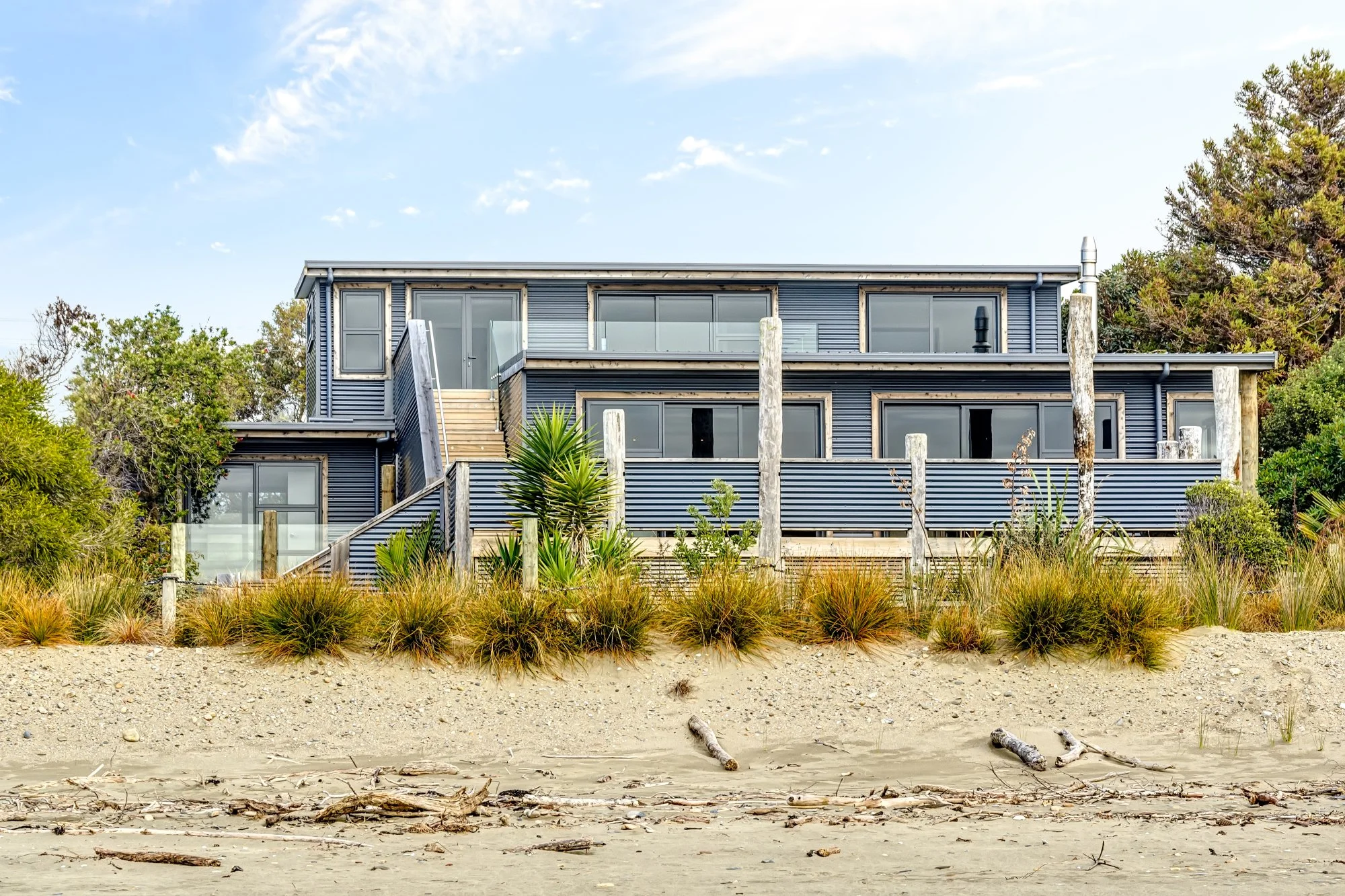 A theme of easy care corrugated cladding and rustic timber posts and weathered reveals, ties the home into the beach landscape. Numerous decks invite you outdoors providing the perfect indoor outdoor flow, no matter what direction the wind is blowing.