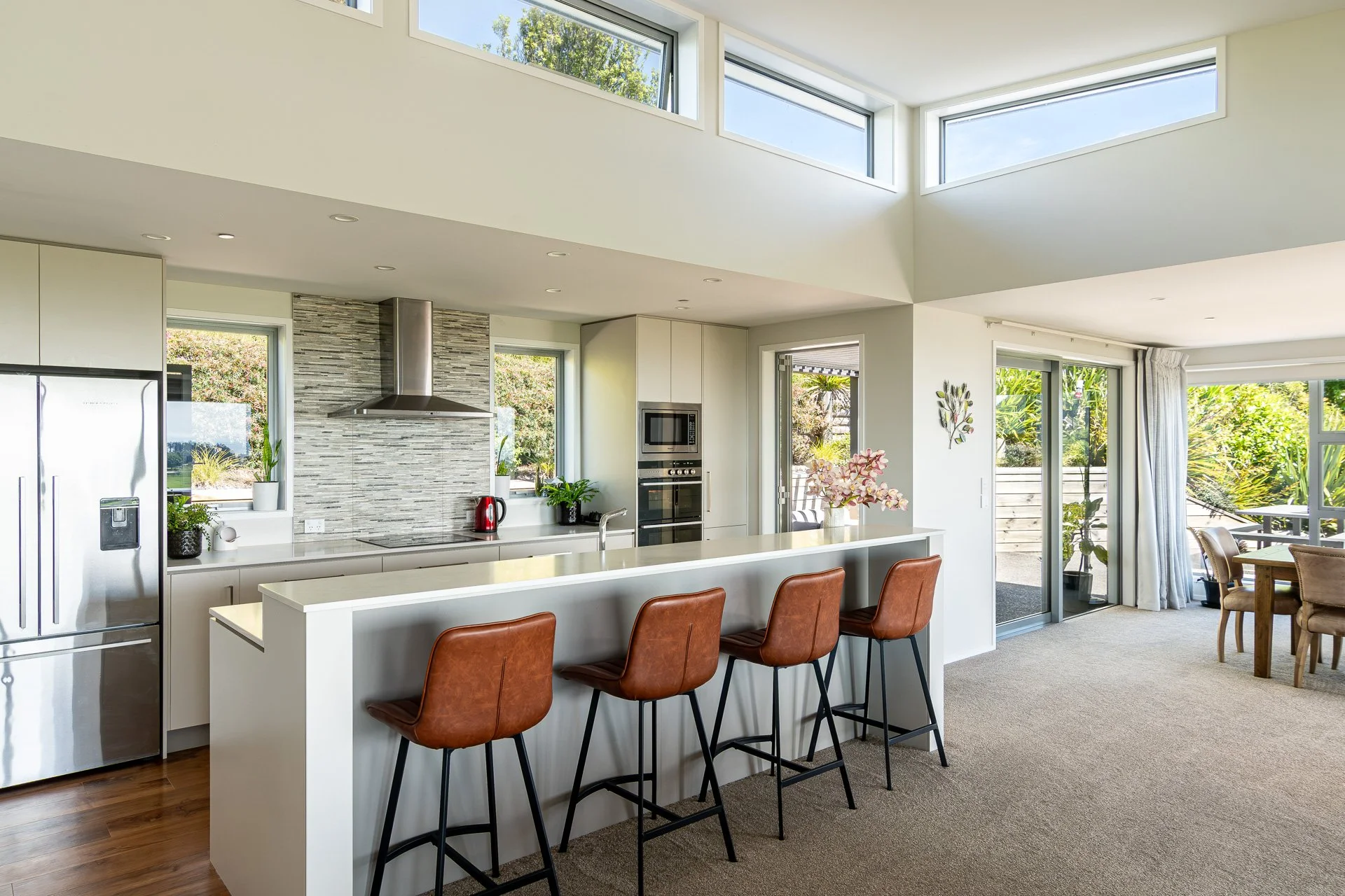 There is easy access to the outdoors through large sliding doors to verandahs and the northern entertainment terrace. The kitchen, dining and living room are connected in a relaxed, open plan but also defined as their own separate spaces with the use of differing ceiling heights.