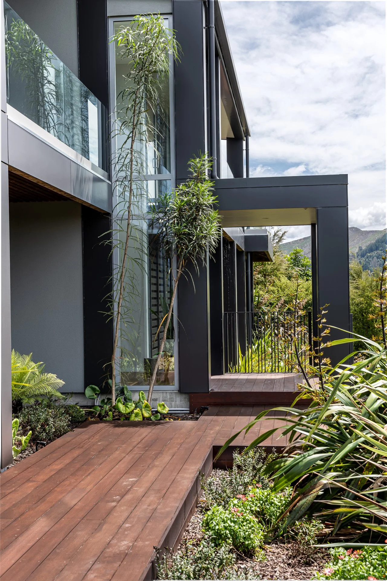 It's nestled across a moderately steep north east facing slope which has been densely planted in natives. Large eastern facing glazing let in the morning sun and views while high windows to the west capture the last of the afternoon's rays.