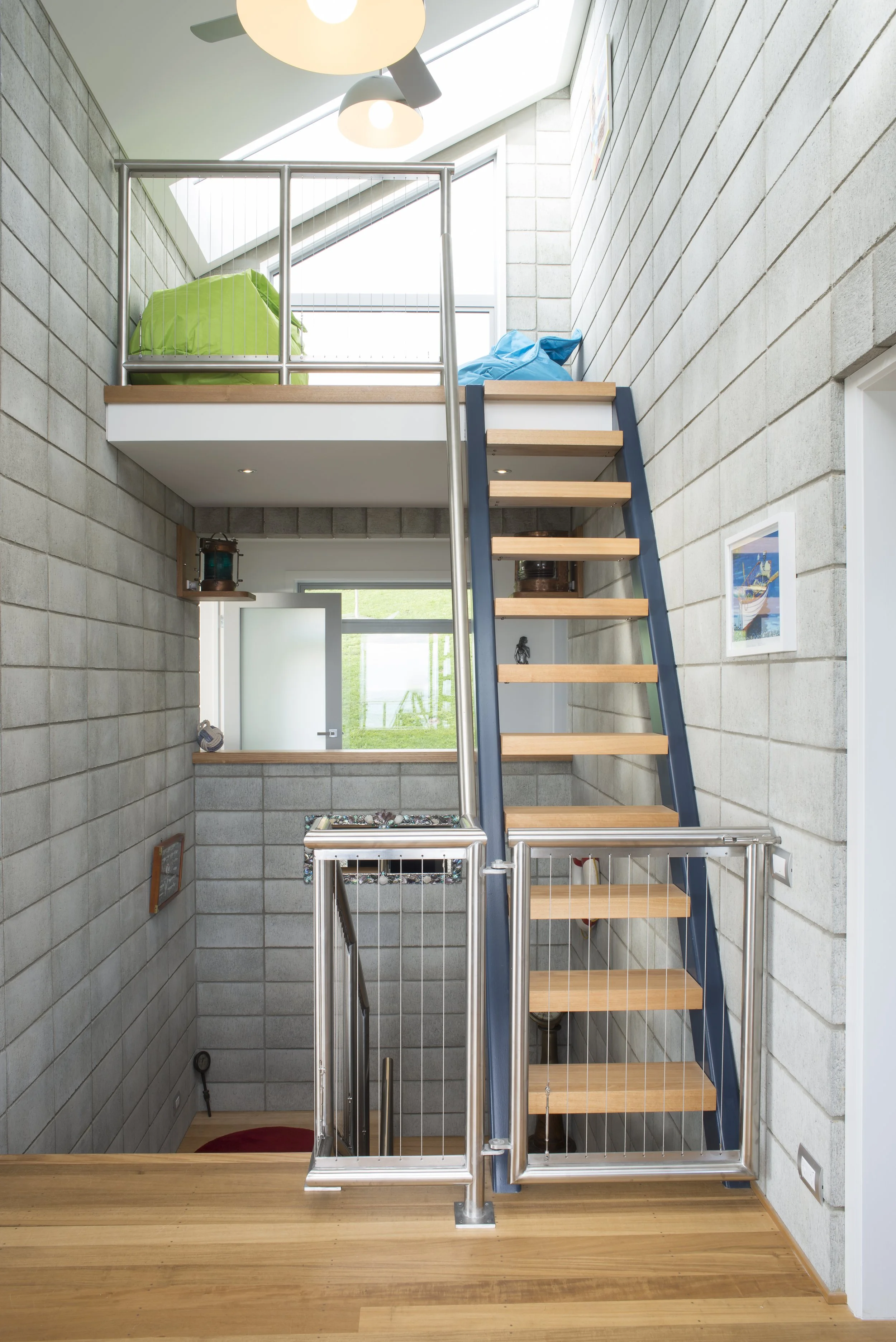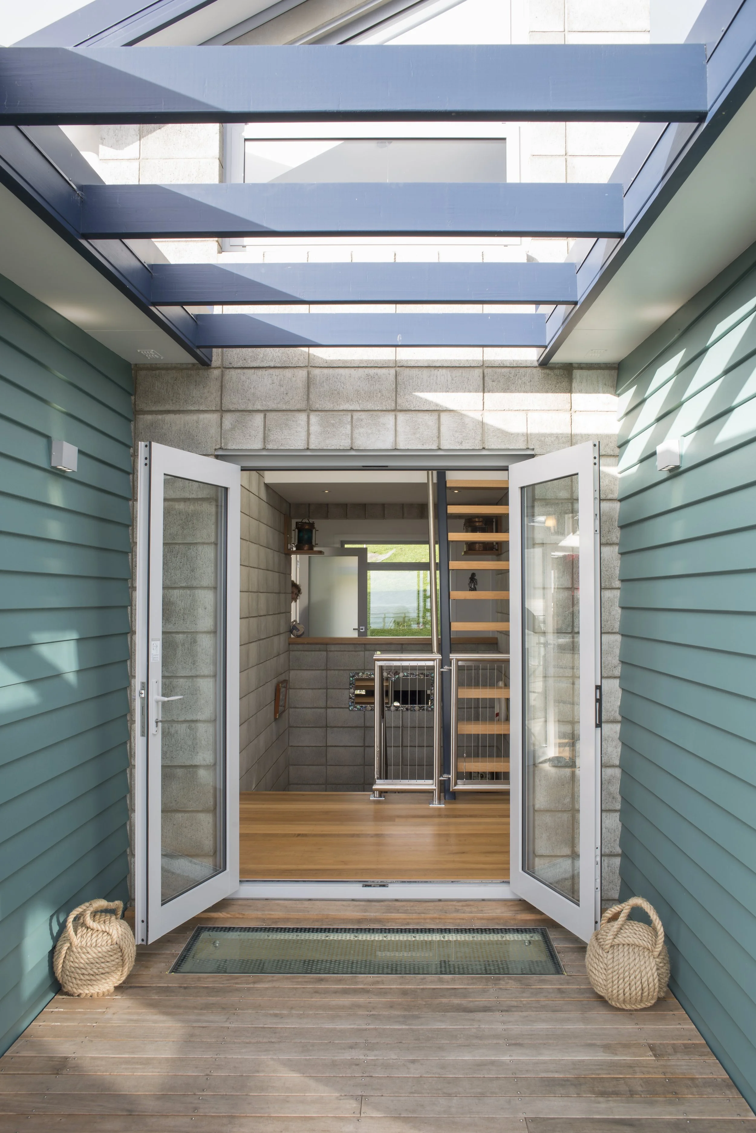 The roof forms key off the contours of the hills mimicking the slope down to the harbour. In the plan the layout is anchored around a concrete block tower providing vertical access and light. The towers' roof deviates from the rest of the house providing a northern slope for solar hot water panels. Large eaves to the west provide shade from the hot afternoon sun without diminishing the stunning views.